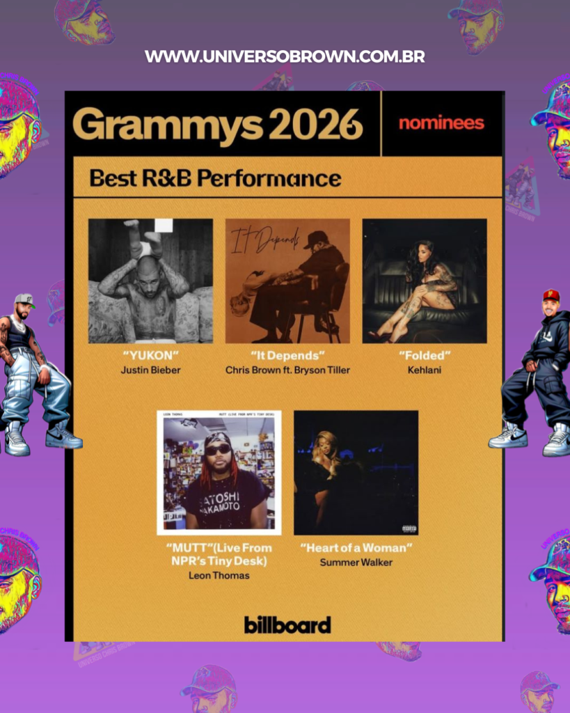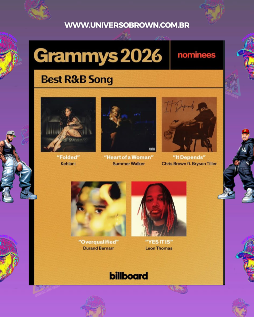 Com essas indicações, Chris Brown se torna um artista com 27 nomeações para o GRAMMY, lembrando que ele já venceu com “F.A.M.E.” (2012) e “11:11” (2025) como Melhores Álbuns R&B.
