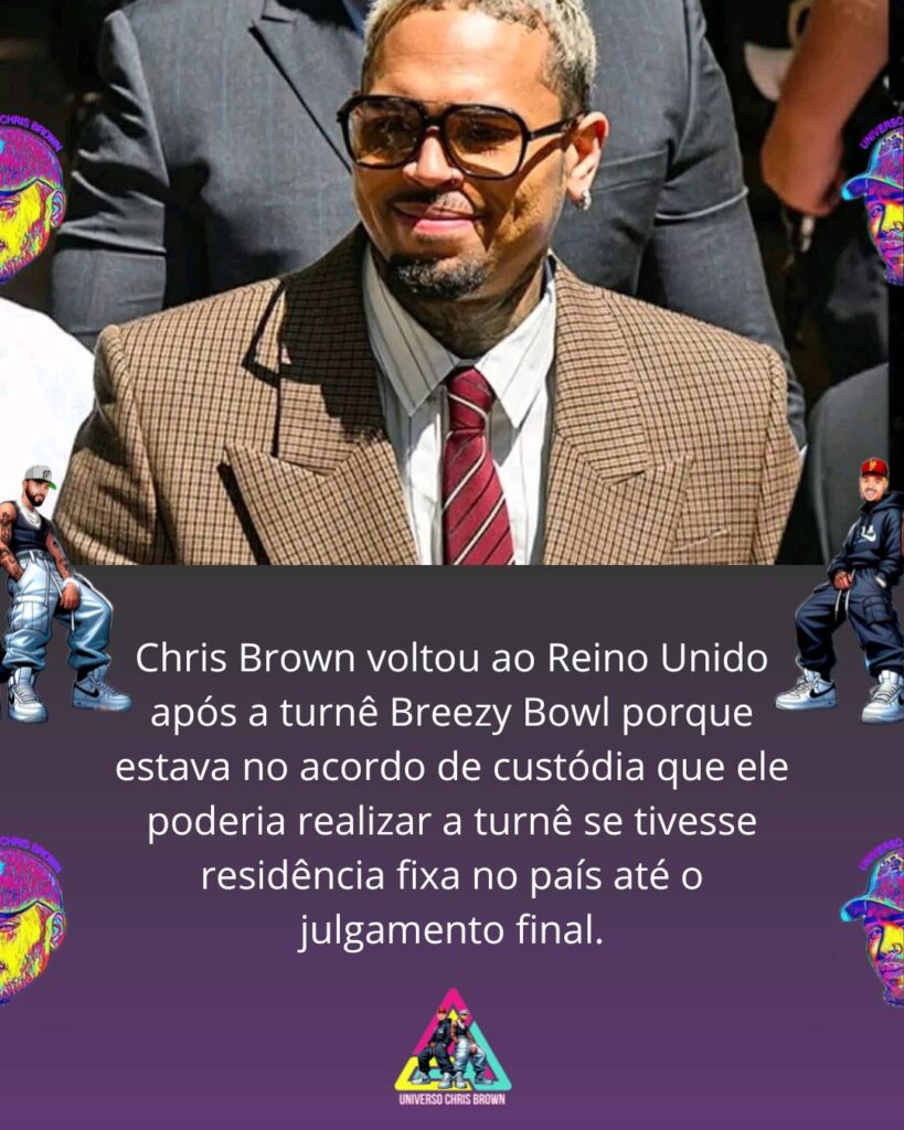 Essa semana lembrei o fato do Chris Brown ter voltado ao Reino Unido após a turnê porque estava no acordo de custódia que ele poderia fazer a turnê se tivesse residência fixa no país até o julgamento final.
