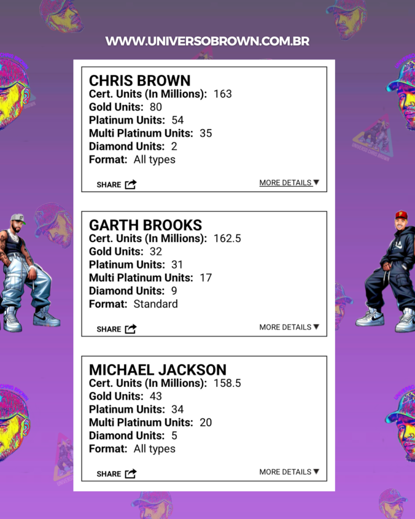 CB tem 163 milhões e MJ 158,5 milhões, se tornando o cantor negro mais vendido na história da RIAA. Todas a informações citas é sobre números nos EUA e não globalmente.